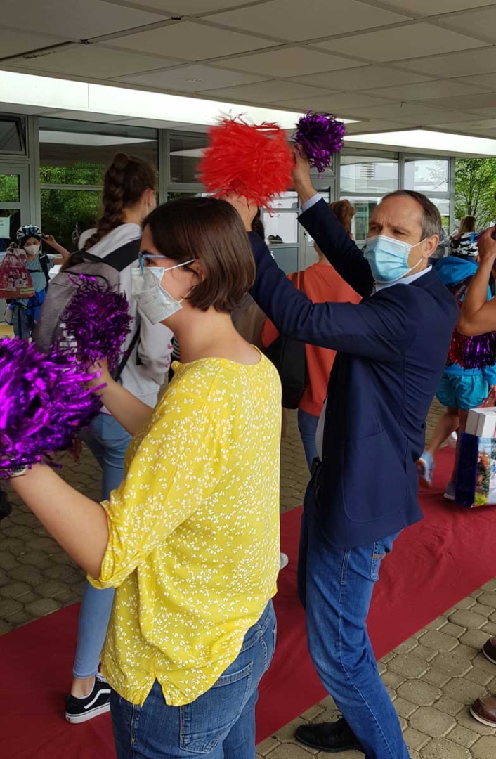 In ganz besonderer Manier wurden am letzten Schultag alle Schüler*innen des Schlossgymnasiums von ihren Lehrer*innen samt Schulleitung verabschiedet: Auf einem vor ihnen ausgerollten roten Teppich durften die Schüler*innen von der Lehrerschaft bejubelt und gefeiert durch ein Spalier von tanzenden Pompoms den Ferien entgegenschreiten. Nach all den zurückliegenden Monaten des Fernunterrichts, der Freundschaften auf Distanz, der Belastungen innerhalb der Familien hatte das Kollegium des Schlossgymnasiums beschlossen, dass es Zeit ist, die von der Pandemie in so vielen Bereichen ihres Lebens eingeschränkten Jugendlichen gebührend in ihre Sommerferien zu verabschieden und sie wissen zu lassen: Ihr seid unsere Helden! Wer am Ende die größere Freude bei dieser einmaligen Aktion hatte, das Kollegium oder die Schülerschaft, konnte nicht eindeutig entschieden werden. Aber für alle gilt: Endlich Ferien!
