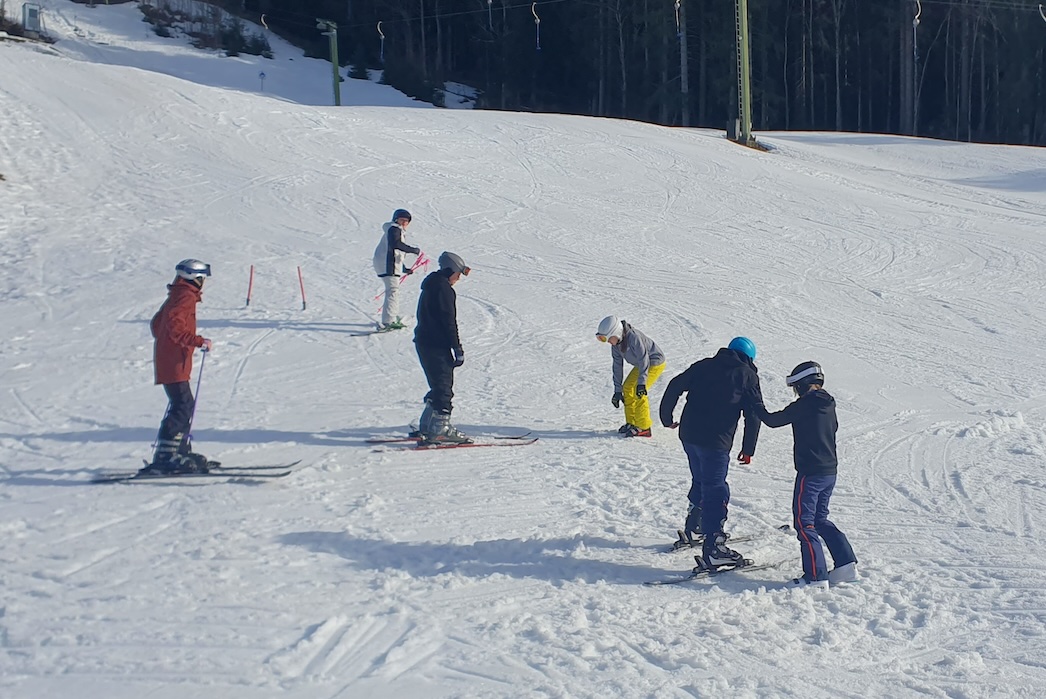 Am Morgen des 05.02. trafen wir uns und starteten gemeinsam von der Stiftung Tragwerk aus Richtung Kleinwalsertal. Angekommen verräumten wir unser Gepäck in Container, die von einem Pistenbulli für uns auf die Hütte transportiert wurden. Anschließend schnallten wir uns unsere Skier an und lifteten in unseren Alltagsklamotten zur direkt an der Piste gelegenen Wildentalhütte. Eingetroffen in der Unterkunft verteilten und bezogen wir die Zimmer, um dann direkt wieder Ski fahren zu können. Dabei hatten wir das erste Mal die Gelegenheit zum besseren Kennenlernen der Schüler der Janusz-Korczak-Schule.