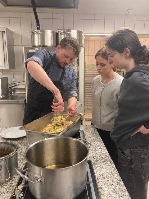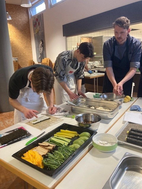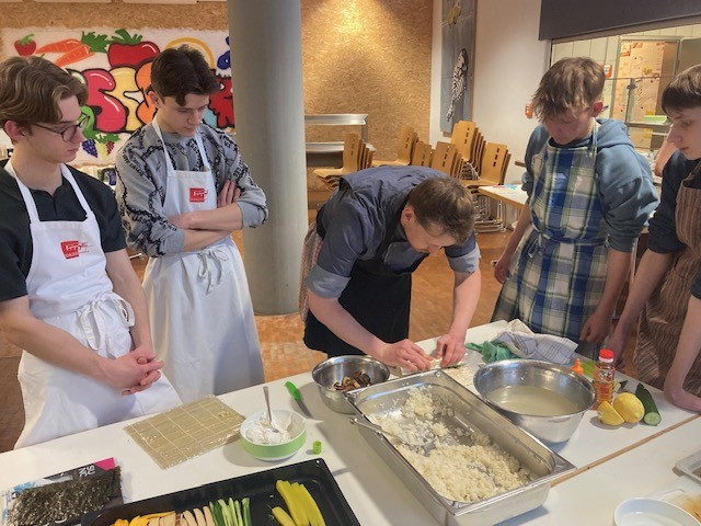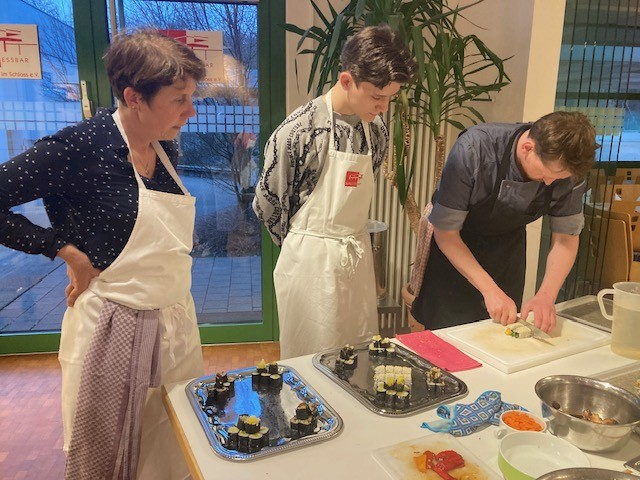 Wie bereits im vergangenem Jahr durften die Schüler gemeinsam mit dem ehemaligen Schlossler und heutigem Profikoch Carl-Philipp Moselewski einen kulinarischen Abend in der Mensa gestalten: Dieses Jahr stand ein asiatisches Vier-Gänge-Menü auf der Tagesordnung. Nach einer kleinen Einführung konnten die Schüler die Zubereitung der einzelnen Gänge in Kleingruppen selbst in die Hand nehmen. Wo bei manchen noch die Küchenerfahrung fehlte, gaben die Mensa-Gastgeberinnen Martina Burkhardt und Dagmar Köber gerne Hilfestellung. Dabei wurde auch viel gelernt (Statt echtem Wasabi wird meistens nur gefärbter Meerrettich verwendet!)