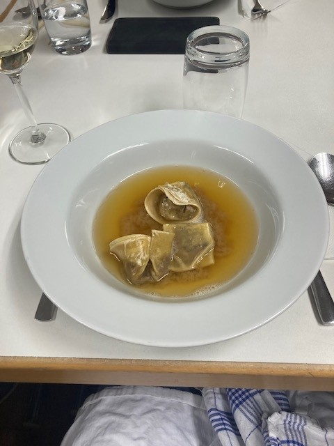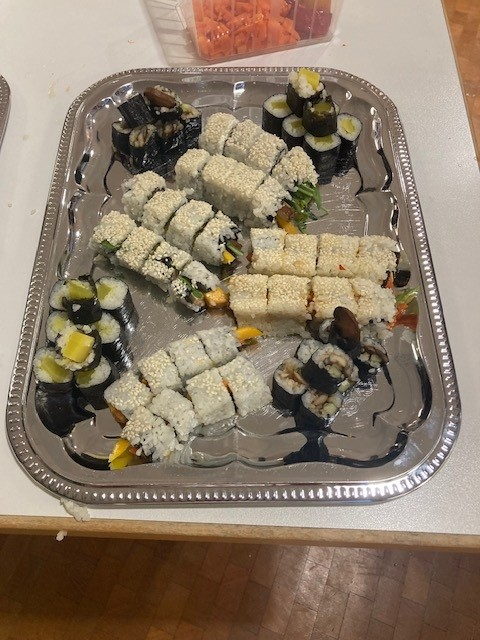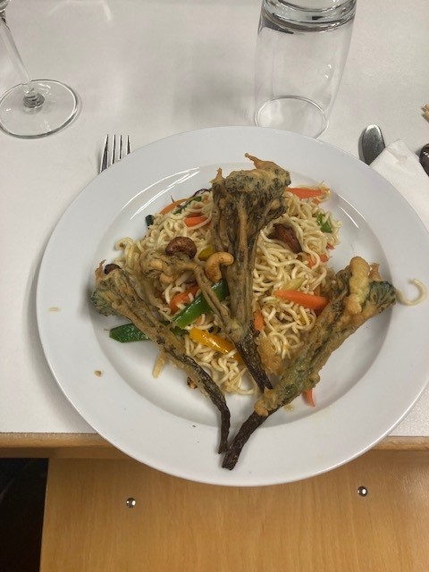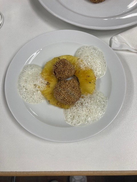 Als nach drei Stunden alles fast fertig zubereitet war, durften alle am geschmackvoll gedeckten Tisch Platz nehmen. Zur Vorspeise wurde veganes Suhsi und Wan-Tan-Suppe serviert (das asiatische Pendant zur Maultaschensuppe), die Hauptspeise bildeten Mie-Nudeln mit Cashews in Erdnusssauce und wilde Brokkoli Tempura und als süßen Abschluss gab es gegrillte Ananas mit Sesambällchen und Limetten-Schaum. Bei angenehmen Gesprächen wurden schon inoffizielle Verabredungen fürs nächste Jahr gemacht und nach dem Essen konnten alle Schüler stolz und satt nach Hause gehen. Unser besonderer Dank gilt Carl-Philipp, der das Menü zusammengestellt, alle Zutaten eingekauft und mit seinem Know-How die Schüler angeleitet hat. Außerdem danken wir Martina Burkhardt und Dagmar Köber für ihre Unterstützung und Bereitstellung der Mensa.