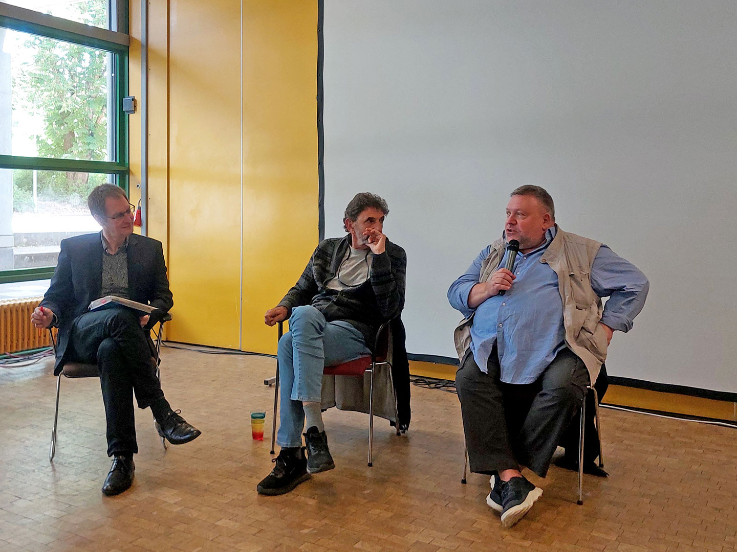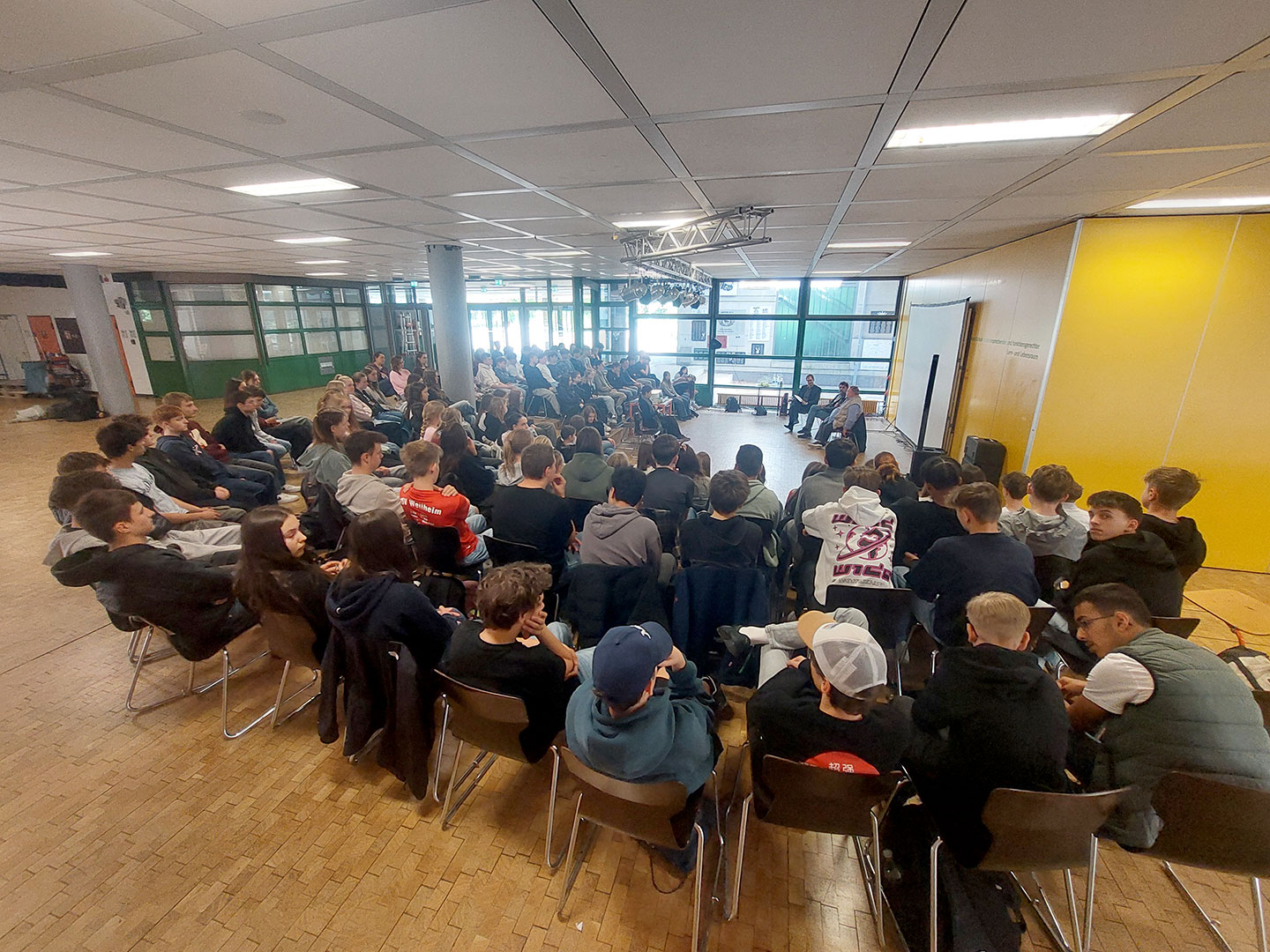 Am Ende der Diskussion, bei der die Schüler*innen zahlreiche Fragen stellen konnten, erinnerte Mario Vollweiler noch einmal an die Irrationalität rechter Erzählungen von einer vermeintlichen völkischen Gemeinschaft, die heute wieder Zulauf haben: „Wir sind alle Migranten.“ Ein Satz, der in der vielfältigen Schülerschaft des Schlossgymnasiums auf Zustimmung stieß. Angesichts des neuen Erstarkens der Rechtsextremen mahnte auch Roberto Frankenthal: „Eigentlich ist es fünf nach zwölf.“