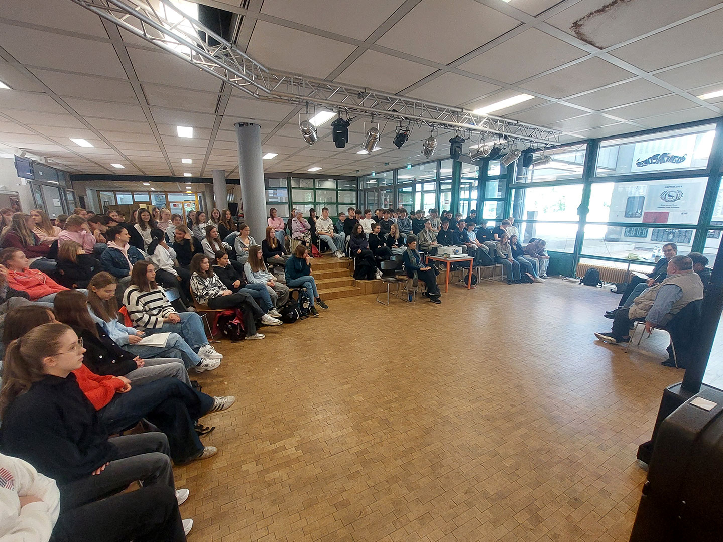 Am 23.05.2025 lauschten die Schüler*innen der neunten Klassen den Erzählungen Mario Vollweilers und Roberto Frankenthals über das Schicksal ihrer aus Kirchheim geflohenen Familie und deren Emigrantenleben in Buenos Aires.