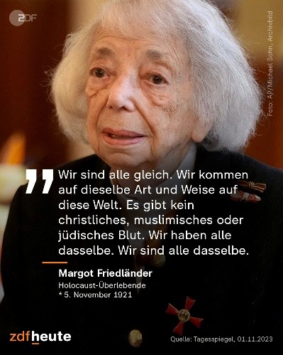 Und es ist eben immer noch nicht vorbei. Wir alle sind Zeitzeugen eines Antisemitismus, der in allen Teilen der Gesellschaft wieder salonfähig zu werden droht. Es ist an uns allen, Margot Friedländers Mahnung in unserem Lebensalltag zu beherzigen und dafür einzustehen.