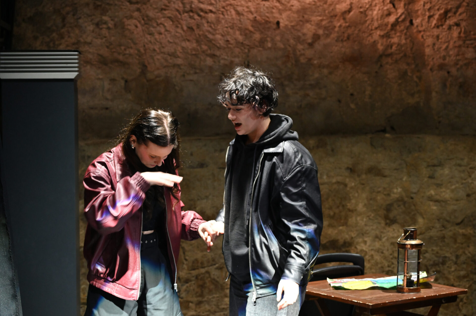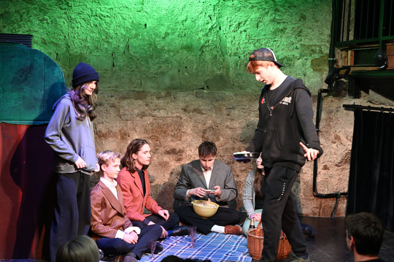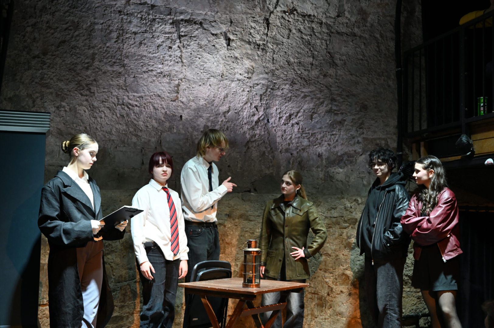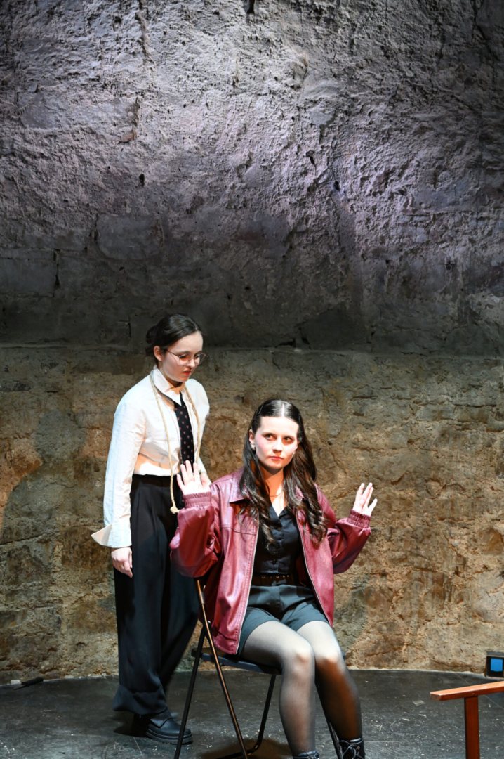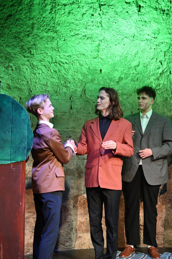Die Dynamik des auf kleinster Bühne aufgeführten Stückes lässt kaum Verschnaufpausen zu, schon gar nicht für das umtriebige Ensemble, welches über schmale, steile Treppen und niedrige Gänge gekonnt die verschiedenen Szenen betritt und ebenso flugs wieder verschwunden ist. Dabei beeindruckt die Textsicherheit und souveräne Spielweise der Protagonisten über den gesamten Verlauf des Stücks hinweg in allen Besetzungen. Trotz Klausuren, Vorbereitungen auf das bevorstehende Abitur und eines intensiven Schulalltags gelingt es den jungen Schauspielenden, den Eindruck von Leichtigkeit und vor allem großer Freude beim Spielen zu erwecken.