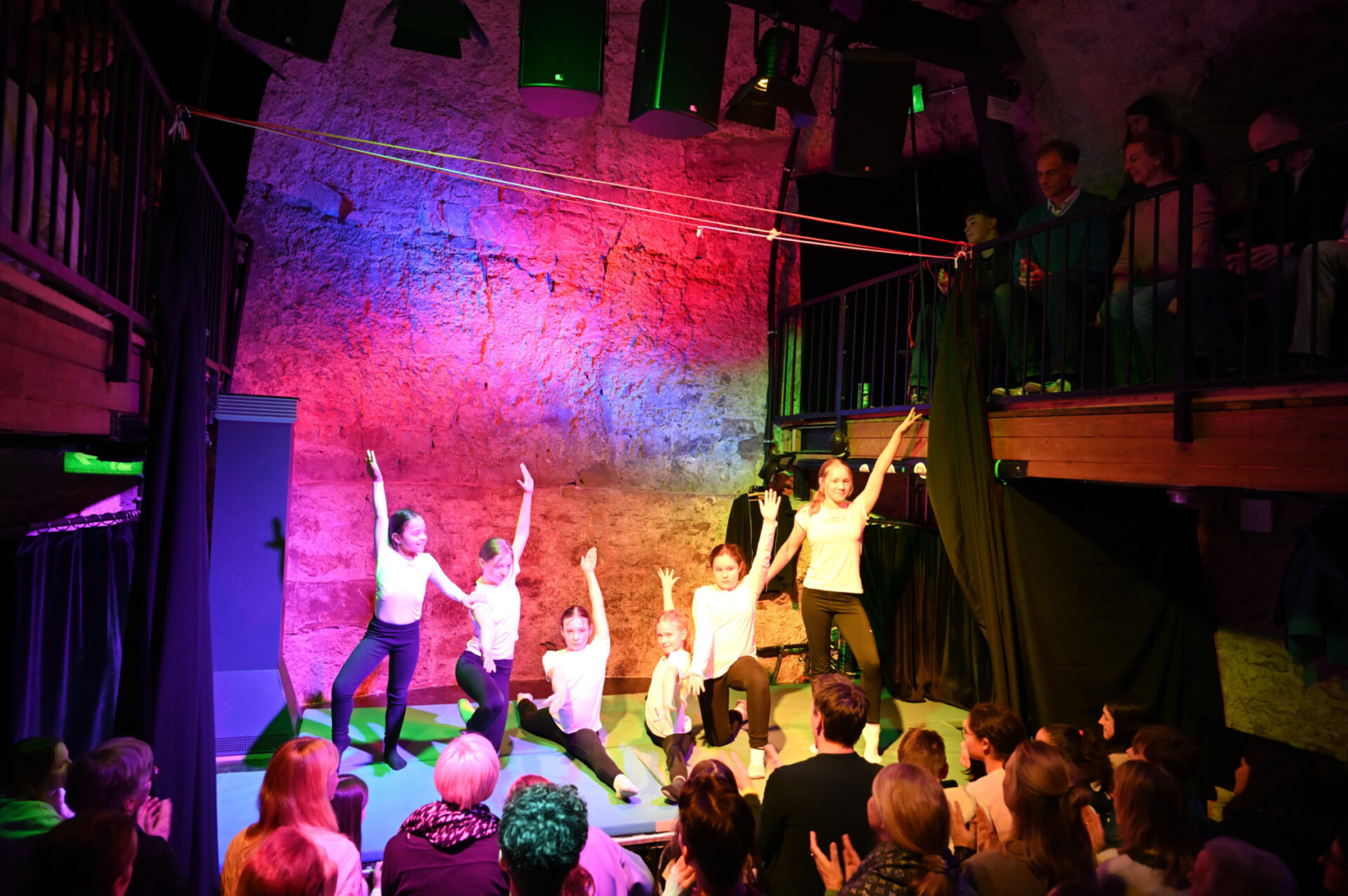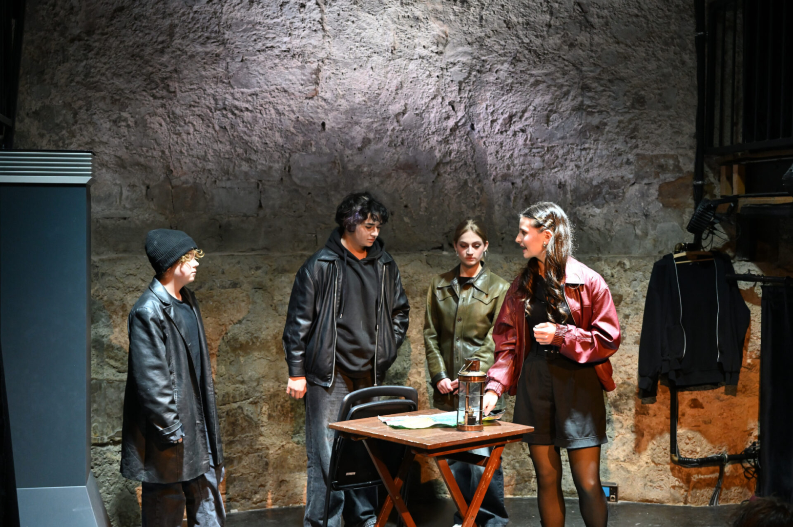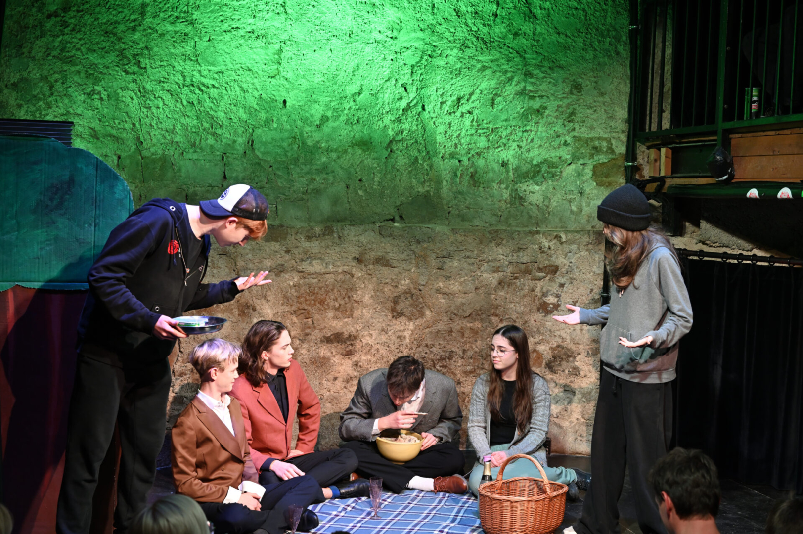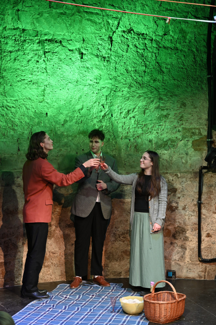 Die Dynamik des auf kleinster Bühne aufgeführten Stückes lässt kaum Verschnaufpausen zu, schon gar nicht für das umtriebige Ensemble, welches über schmale, steile Treppen und niedrige Gänge gekonnt die verschiedenen Szenen betritt und ebenso flugs wieder verschwunden ist. Dabei beeindruckt die Textsicherheit und souveräne Spielweise der Protagonisten über den gesamten Verlauf des Stücks hinweg in allen Besetzungen. Trotz Klausuren, Vorbereitungen auf das bevorstehende Abitur und eines intensiven Schulalltags gelingt es den jungen Schauspielenden, den Eindruck von Leichtigkeit und vor allem großer Freude beim Spielen zu erwecken.