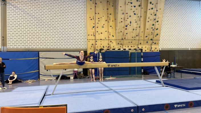 Nach der allgemeinen Erwärmung und dem Einturnen an den Geräten eröffneten wir den Wettkampf am Stufenbarren. Ein perfekter Start in den Wettkampf – ganz ohne Streichwertung erturnte sich die Kürmannschaft des Schlossgymnasiums durch grandiose Übungen (Clara Kieber: 12,9, Nele Gneiting: 12,7, Jana Gneiting: 9,3) einen deutlichen Vorsprung.